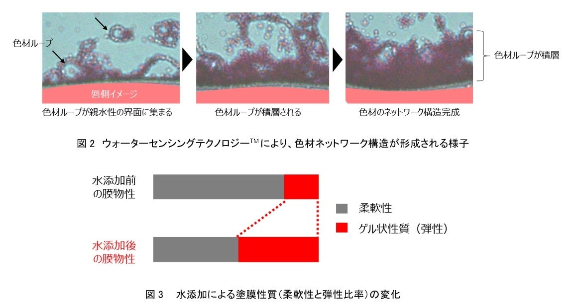 今回、唇上の水と相性の良い油性成分に着目し、新しいアプローチでの色持ち、二次付着レス効果の向上を試みました。開発した「ウォーターセンシングテクノロジーTM」は、唇に塗布すると色材を集め、唇上で蒸発する水を感知して、色材はループを形成します。その色材ループは水と相性がよいため、色材ループが唇のような親水性の界面に集まり、つながることで色材の強固なネットワーク構造が完成し(図1,2)、色持ちの良さが実現します。また、本技術を搭載した口紅の膜性質を調べると、塗布中はなめらかで液体のような流動性を示しており、塗布後に水と反応しネットワーク形成すると、流動性が弱まり、塗膜が心地よい程度のゲル状の性質(弾性)に変わることがわかりました。(図3)