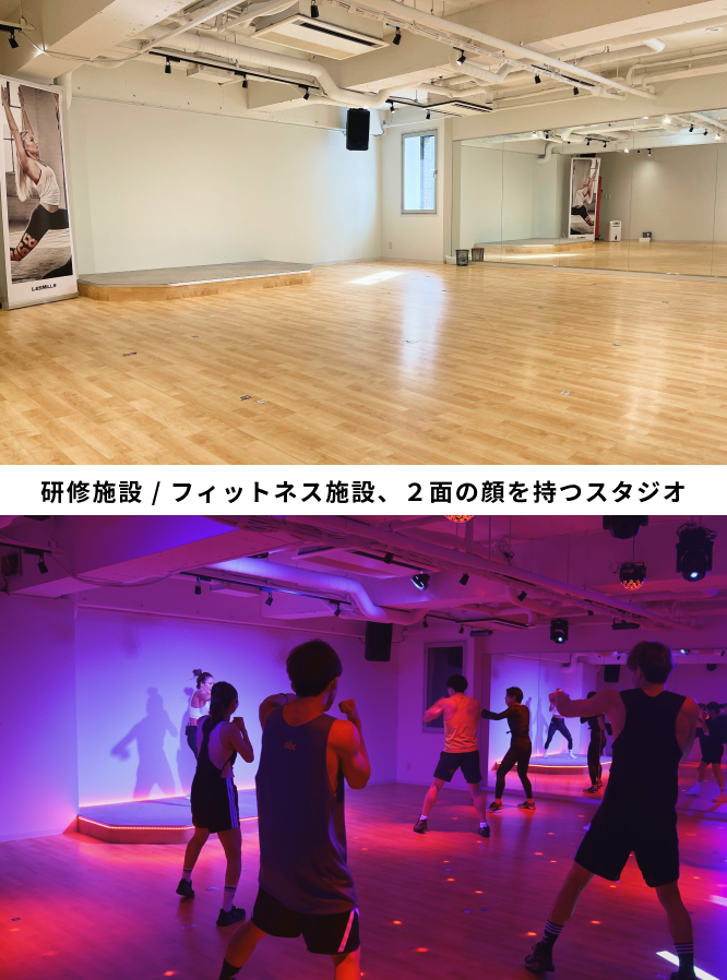 ①平日昼間は研修施設、平日夜と週末はフィットネス施設として運営
