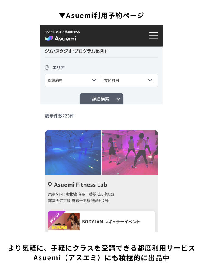 一方で、スタジオは定員いっぱいになってもならなくても固定費(賃料、光熱費、インストラクターへの報酬等)は変わず、余ったレッスン枠は収益化しない遊休資産となっています。「Asuemi Fitness Lab」は、従来の月会費収益に固執せず、レッスンの空き枠を有効活用しています。具体的には、自社が運営する都度払いマッチングフィットネスサービス「Asuemi」( https://asuemi.com/gymlessons )にレッスンの空き枠を積極的に出品し、月会費を支払わずにフィットネス施設を利用したい初心者向けにリーズナブルな選択肢を提供しています。これにより、フィットネス施設を利用してこなかったような幅広い層のユーザーに来館いただけるようになりました。結果、各レッスン毎の収益性をあげることができています。