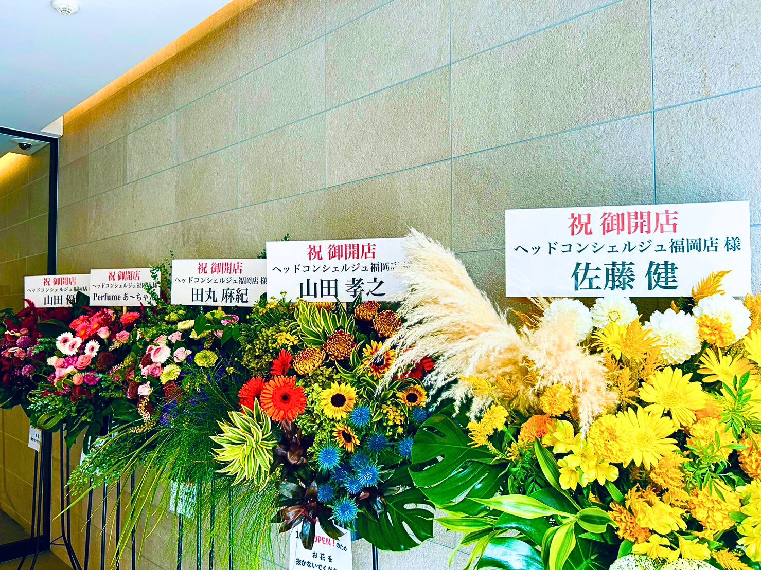 今回、福岡店のオープンも様々な著名人の方に祝福していただき、俳優の佐藤健さん・山田孝之さん、女優の田丸麻紀さん、アーティストのPerfume あ〜ちゃんさん、モデルの山田優さんからの祝花が店先を彩り、一般の方のファンだけではなく芸能界からのファンも増えていることを物語っている。