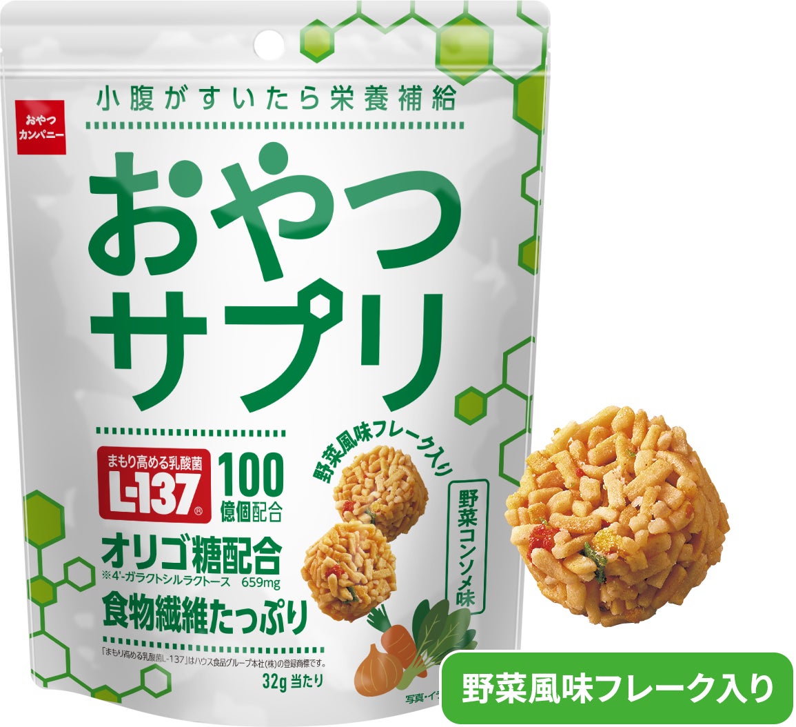 「サンキュ!明るいミライ大賞 for woman」を受賞した「おやつサプリ(野菜コンソメ味)」は、トマト、カボチャ、ほうれん草などの野菜風味フレークを混ぜ込んだザクザク食感のビッツを、優しい味わいの野菜コンソメフレーバーで味付けし、ひとくちサイズに仕上げています。1袋(32g)に『まもり高める乳酸菌L-137®』100億個とオリゴ糖を配合。食物繊維もたっぷり摂れるカラダに嬉しいおやつです。