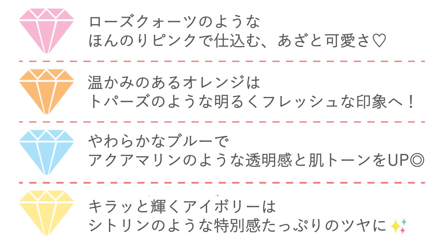 4色を混ぜて使用すると1色では表現できないような肌なじみの良さと透明感、自然な立体感を演出することができ、贅沢な輝きを楽しめる特別な4色ハイライトです。宝石をイメージした見た目で、高揚感を感じさせてくれるはず!
