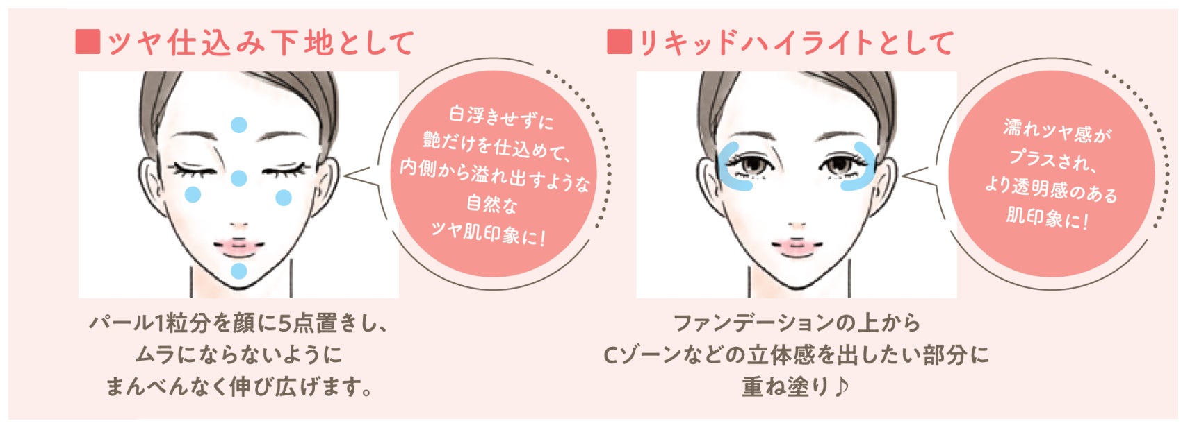 ツヤを仕込む下地として、またCゾーンや明るさが欲しい部分にリキッドハイライトとして重ね塗りをしてもより透明感のある肌仕上がりに。
