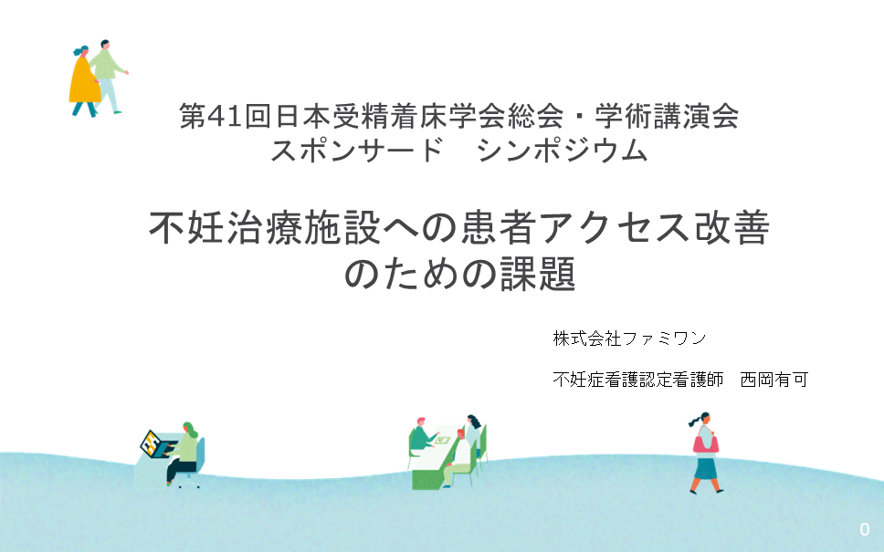 日本受精着床学会総会・学術講演会は2023年7月27日(木曜日)・28日(金曜日)、仙台国際センターにて実施されました。講演会は「ART2023 変わらぬ路と新たなる歩み―保険診療のステージへ―」と題し、会長は医療法人翔仁会 仙台ARTクリニック理事長の吉田 仁秋氏が務めております。ファミワンの西岡は、7月28日(金)10:50~11:50のスポンサードシンポジウム2にて「患者アクセスの考察と卵巣刺激」のプログラムに登壇。不妊治療の保険適用化の患者アクセスの実態と影響要因について「不妊治療施設への患者アクセス改善のための課題」をテーマに講演を行っております。本登壇に向け、妊孕性についての理解度などのアンケートを実施し、その結果とともに考察を発表いたしました。