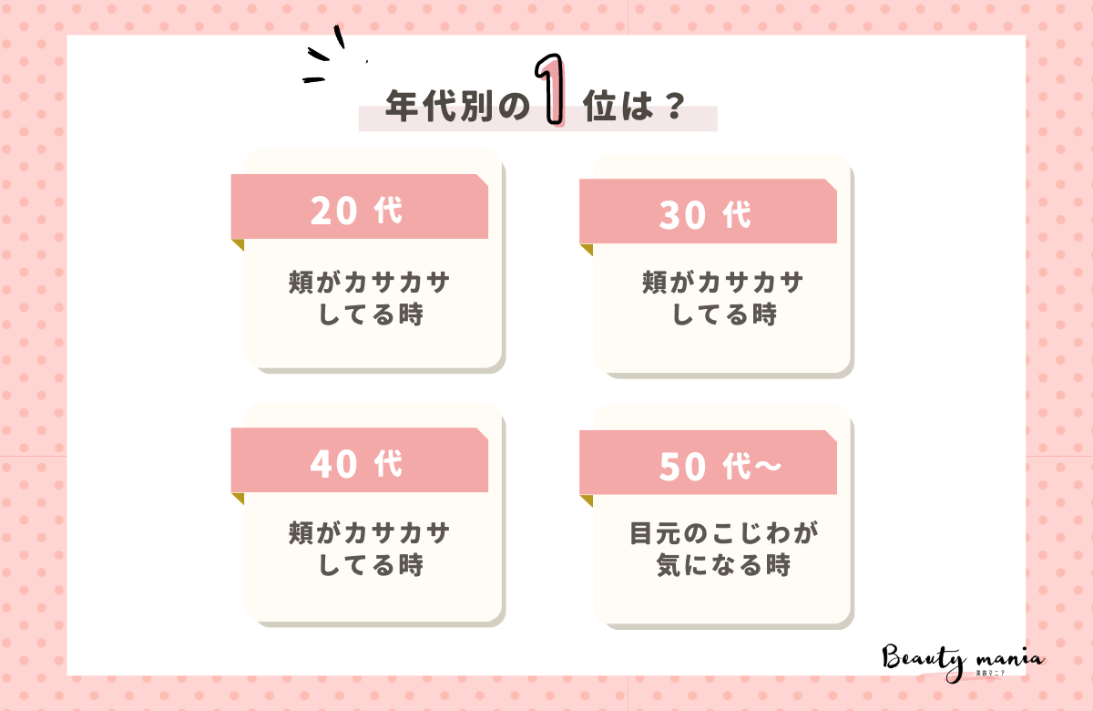 1位の「頬がカサカサしてる時」と回答した理由として「ファンデーションが粉ふく」「メイクが綺麗にできない」などといったメイクのタイミングで気付く人が多い傾向にあることがわかりました。