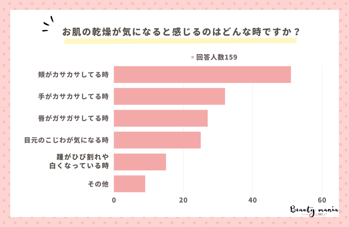 「お肌の乾燥が気になると感じるのはどんな時ですか?」とアンケート調査した結果、1位は『頬がカサカサしてる時(51人)』、2位は『手がカサカサしている時(32人)』、3位は『唇がガサガサしてる時(27人)』となっています。