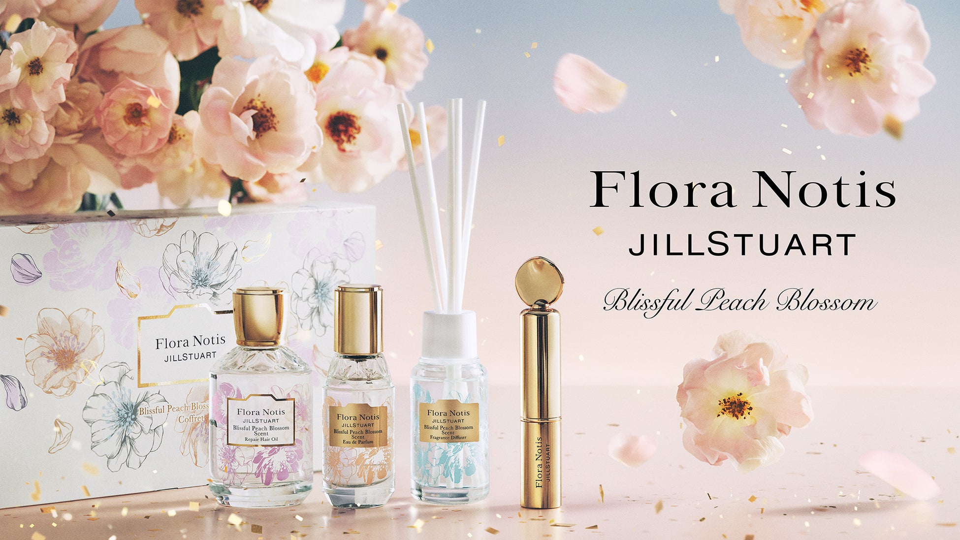 ラテン語で“花の本質”という意味をもつ『Flora Notis JILL STUART』は、ニューヨークを拠点に活躍するファッションデザイナー、ジル・スチュアートの愛する花々へのこだわりと想いが込められた、花の香りに包まれた上質なライフスタイルを提案するブランドです。