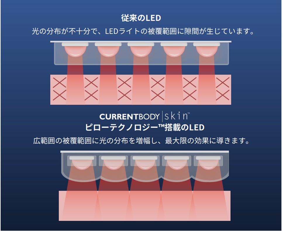 ピローテクノロジー(TM)とは、光を分散させてLEDの照射範囲を最大化する技術です。カレントボディのLEDマスクは、ピローテクノロジー(TM)を搭載することで、LEDライトの被覆範囲を広げ、肌を傷めない最適なLEDライトの光量を、広範囲に肌に届けることが可能です。
