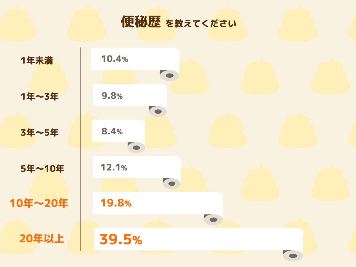便秘症に悩む人の9割が慢性化しており、約半数が10年以上悩まされている事実が明らかに -