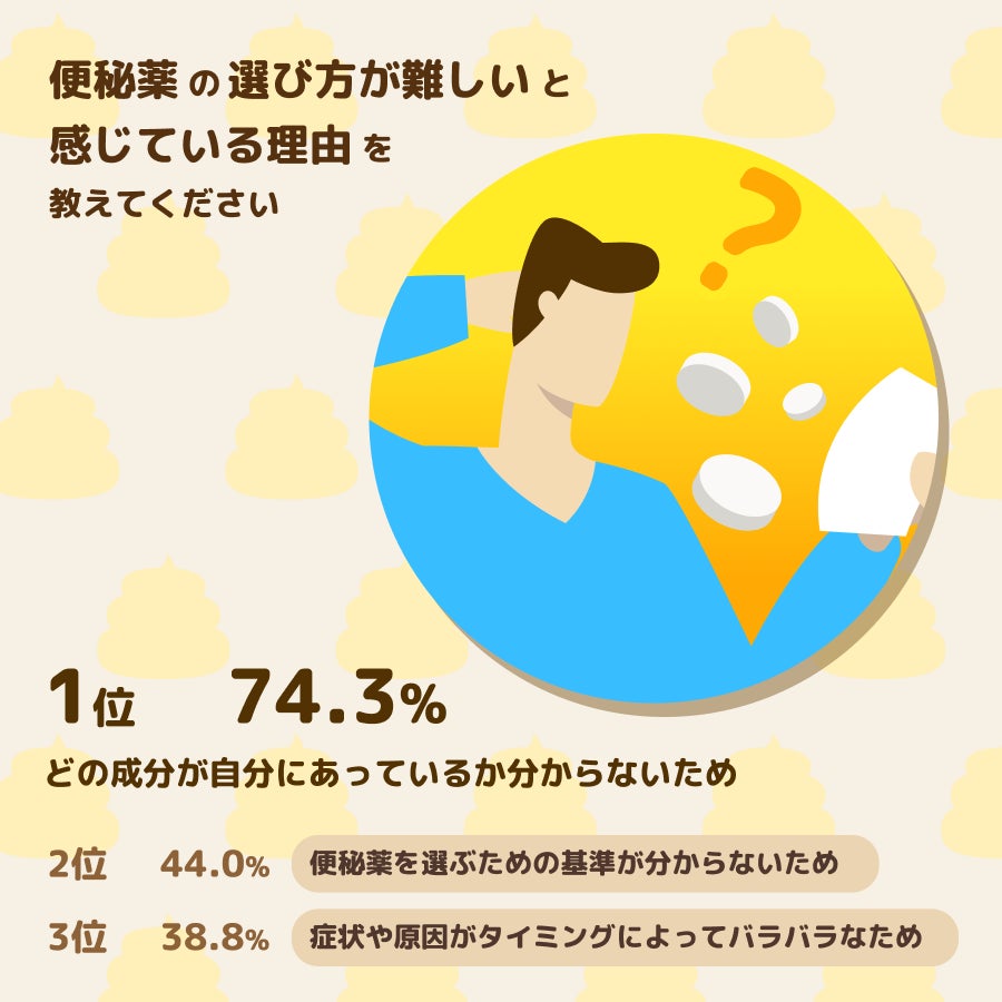 ・便秘薬の選び方が難しい理由として最も多い回答が「どの成分が自分にあっているか分からない」次に「便秘薬を選ぶ上での基準がわからない」、次いで「症状や原因がタイミングによってバラバラだから」となっている。