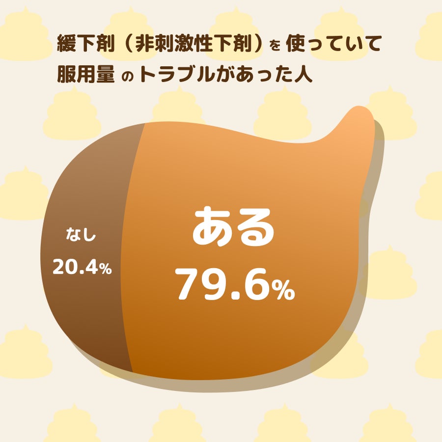 ・ただし、一般的におなかに優しく副作用が少ないと言われる非刺激性下剤ユーザーであっても、約8割が便秘薬の服用量を上手くコントロールできないことが原因で「下痢になってしまう」「スッキリとうんちがでない 」などのトラブルが起きたことがあると回答。