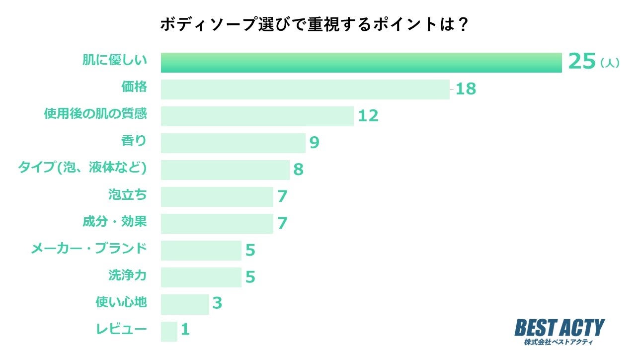 ボディソープ選びで重視するポイントについて100人にアンケートを行ったところ、「肌に優しい」と回答する人が最も多い結果となりました。