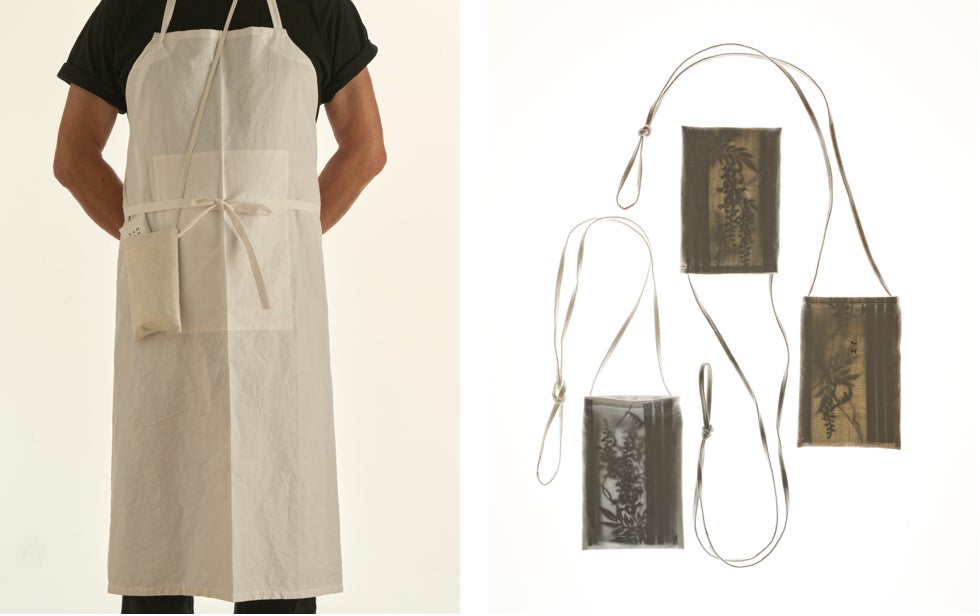エプロンは1950~60年代のフランス製テーブルクロスとベッドシーツを使用し、このアップサイクルのコンセプトには、「ad libitum」「revers de Fortune」の創設者であるビジュアルアーティストのValérie RAMBAUDとアンティーク装飾家のSébastien VERGERが参加しています。また、ミニバッグはアンティークの浴衣生地を使用しています。