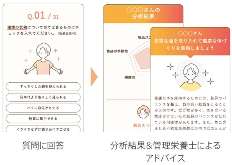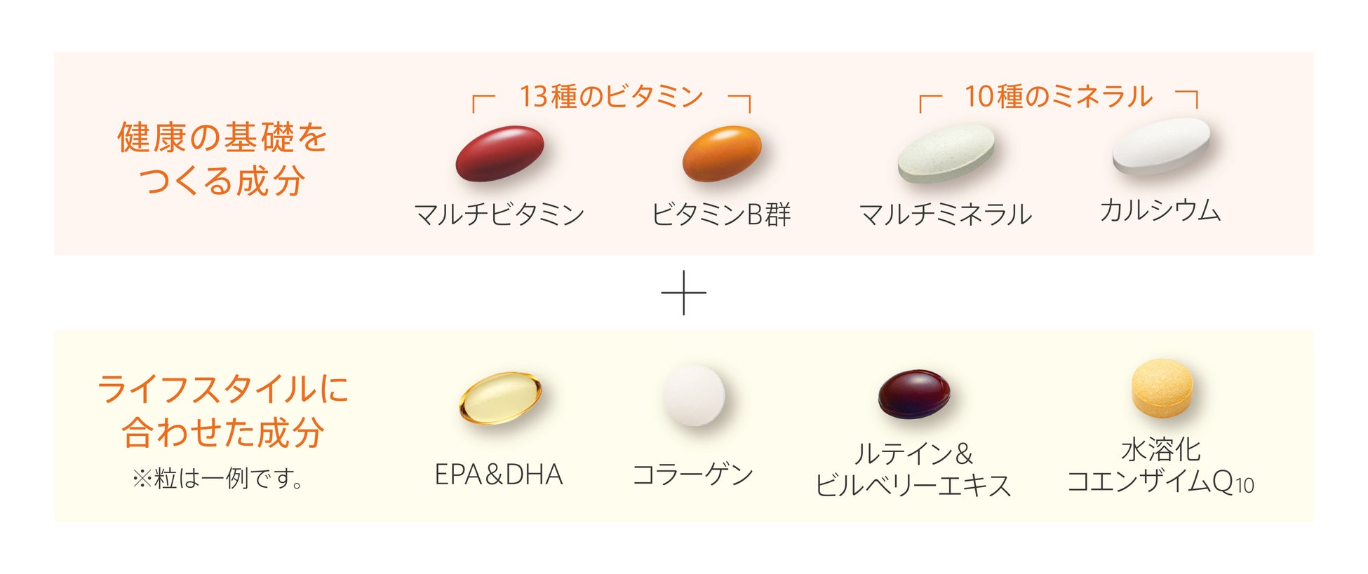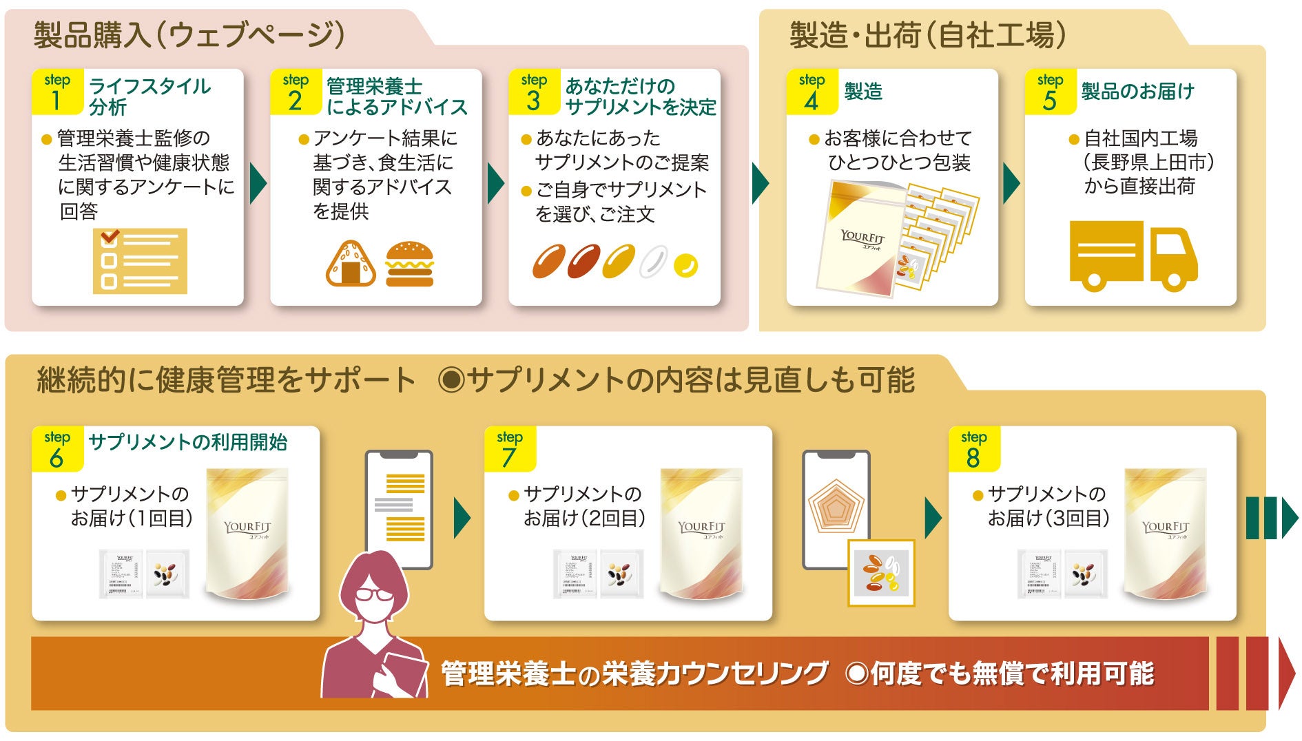 「ユアフィット」をECサイトで購入する際に回答いただくアンケートの内容をもとに、個々のライフ スタイルを分析し、健康の土台となる13種類のビタミン、10種類のミネラルに加え、お客様一人ひとりのライフスタイルにフィットしたサプリメントを組み合わせて提案し、30日ごとに定期的にお届けします。お客様自身でカスタマイズすることも可能で、季節の変わり目やご自身の身体の変化などを踏まえ、ご希望に合わせて見直していただくことも可能です。