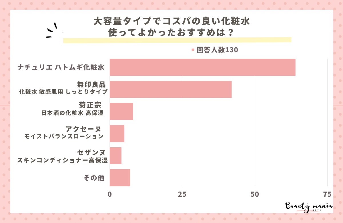 「大容量タイプでコスパの良い化粧水、使ってよかったおすすめ教えてください!」とアンケート調査した結果、1位は『ナチュリエ ハトムギ化粧水(64人)』、2位は『無印良品 化粧水 敏感肌用 しっとりタイプ(42人)』、3位は『菊正宗 日本酒の化粧水 高保湿(8人)』となっています。