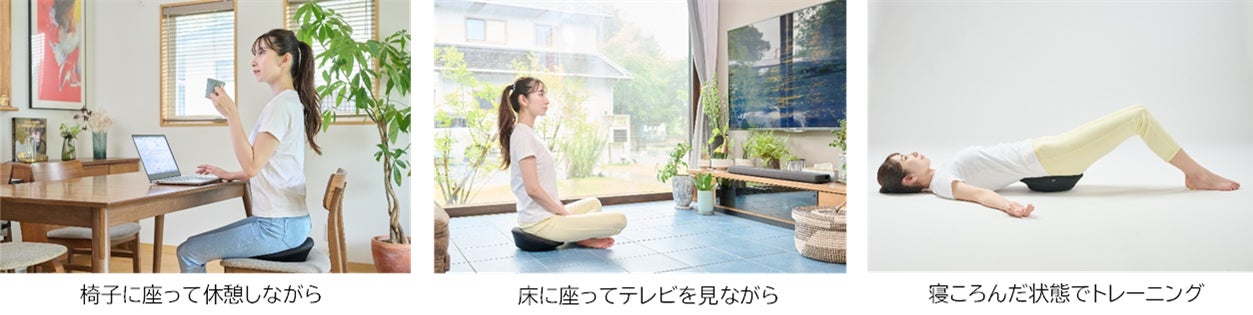 空気で膨らませる一般的なバランスボールに比べて省スペースで、ダイニングチェアやオフィスチェアなど椅子を選ばずどんな座面にも置いて使用できます。座って骨盤を動かすことで仕事中やTVを見ながら、簡単にストレッチができ、「ながら運動」の習慣作りも期待できます。