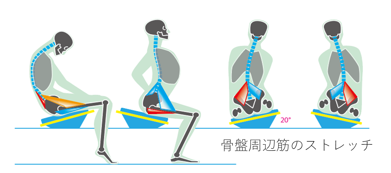 意識して運動しなくても、座ることで不安定さを感じられ、少ない動きで骨盤周りの筋肉のストレッチが行えます。ストレッチをすることで、バランスの取れた姿勢で腰椎の可動域も広げ、骨盤と腰椎周りの筋肉や靭帯が伸びて柔軟性が強化されます。これにより身体の動きがスムーズになり、スポーツ時のパフォーマンス向上や仕事、家事などで腰の負担を軽減することが期待できます。
