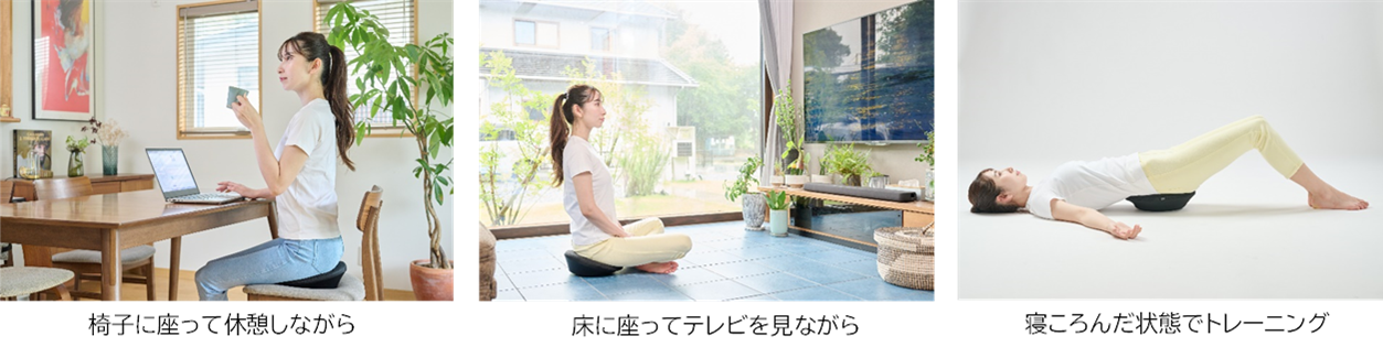 空気で膨らませる一般的なバランスボールに比べて省スペースで、ダイニングチェアやオフィスチェアなど椅子を選ばずどんな座面にも置いて使用できます。座って骨盤を動かすことで仕事中やTVを見ながら、簡単にストレッチができ、「ながら運動」の習慣作りも期待できます。