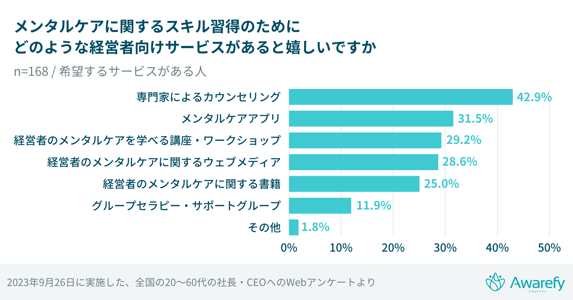 メンタルケアに関するスキル習得のために、どのような経営者向けサービスがあると嬉しいか尋ねたところ、「専門家によるカウンセリング」が最も多く42.9%、「メンタルケアアプリ」が31.5%、「経営者のメンタルケアを学べる講座・ワークショップ」が29.2%と続きました(n=168/希望するメンタルケアサービスがある人)。