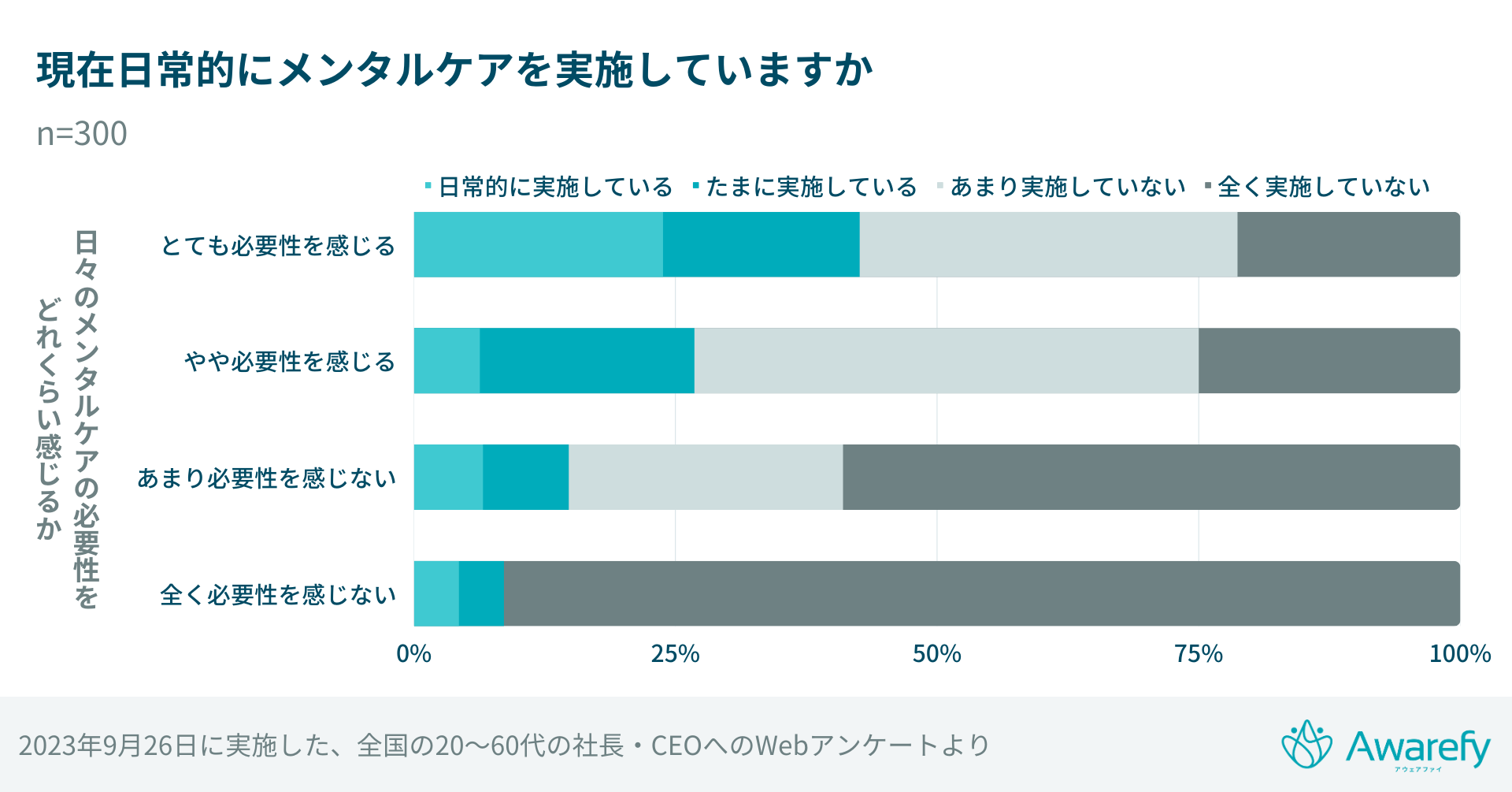 上記の結果からわかるように、メンタルケアの必要性を感じていても実際に実施している人は少ない結果となりました(n=300)。