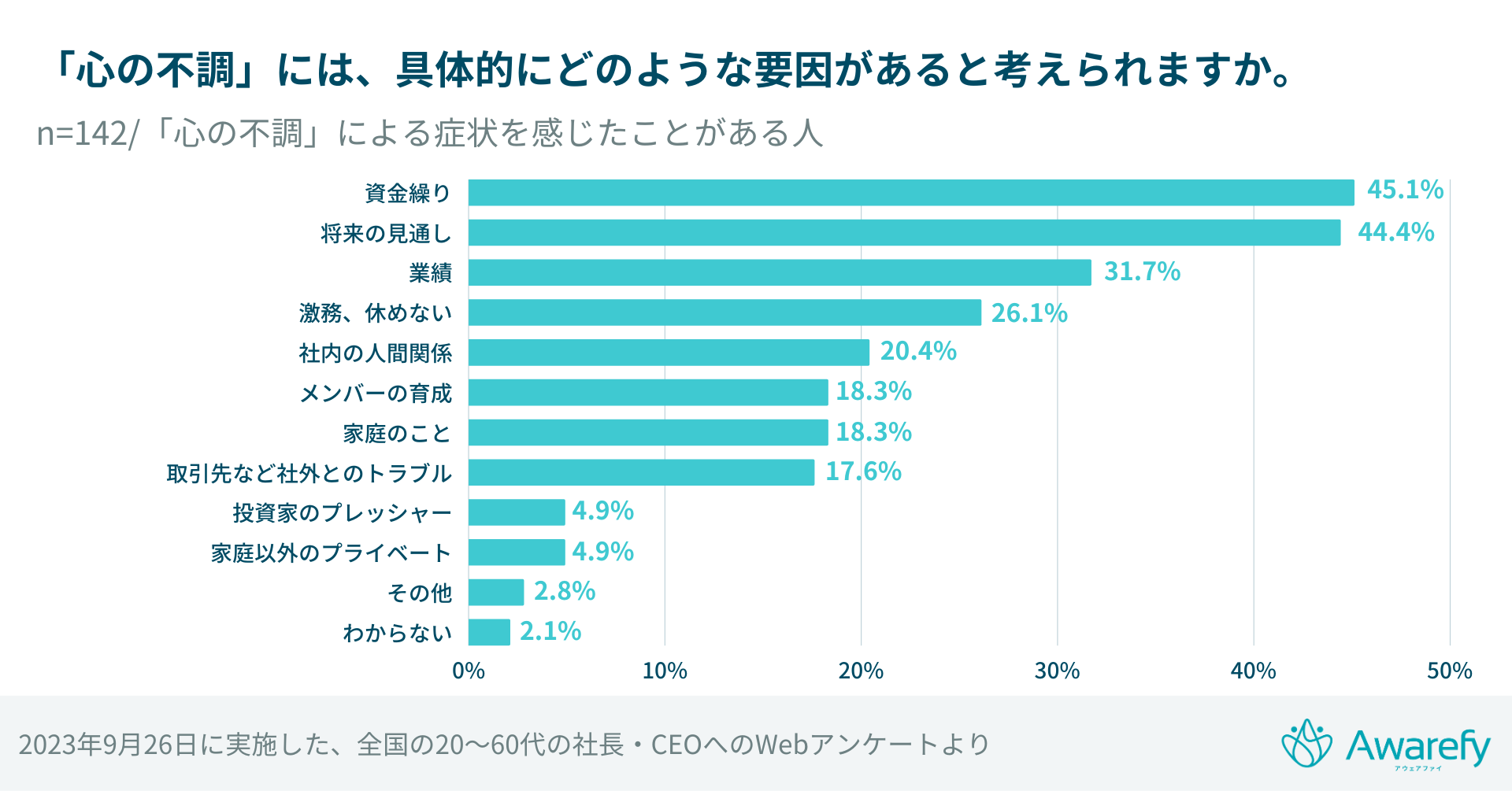 「心の不調」による症状を感じた人に、具体的にどのような要因があると考えられるか尋ねたところ、「資金繰り」が45.1%で最も多く、「将来の見通し」が44.4%、「業績」が31.7%と続きました(n=142/心の不調による症状を感じたことがある人)