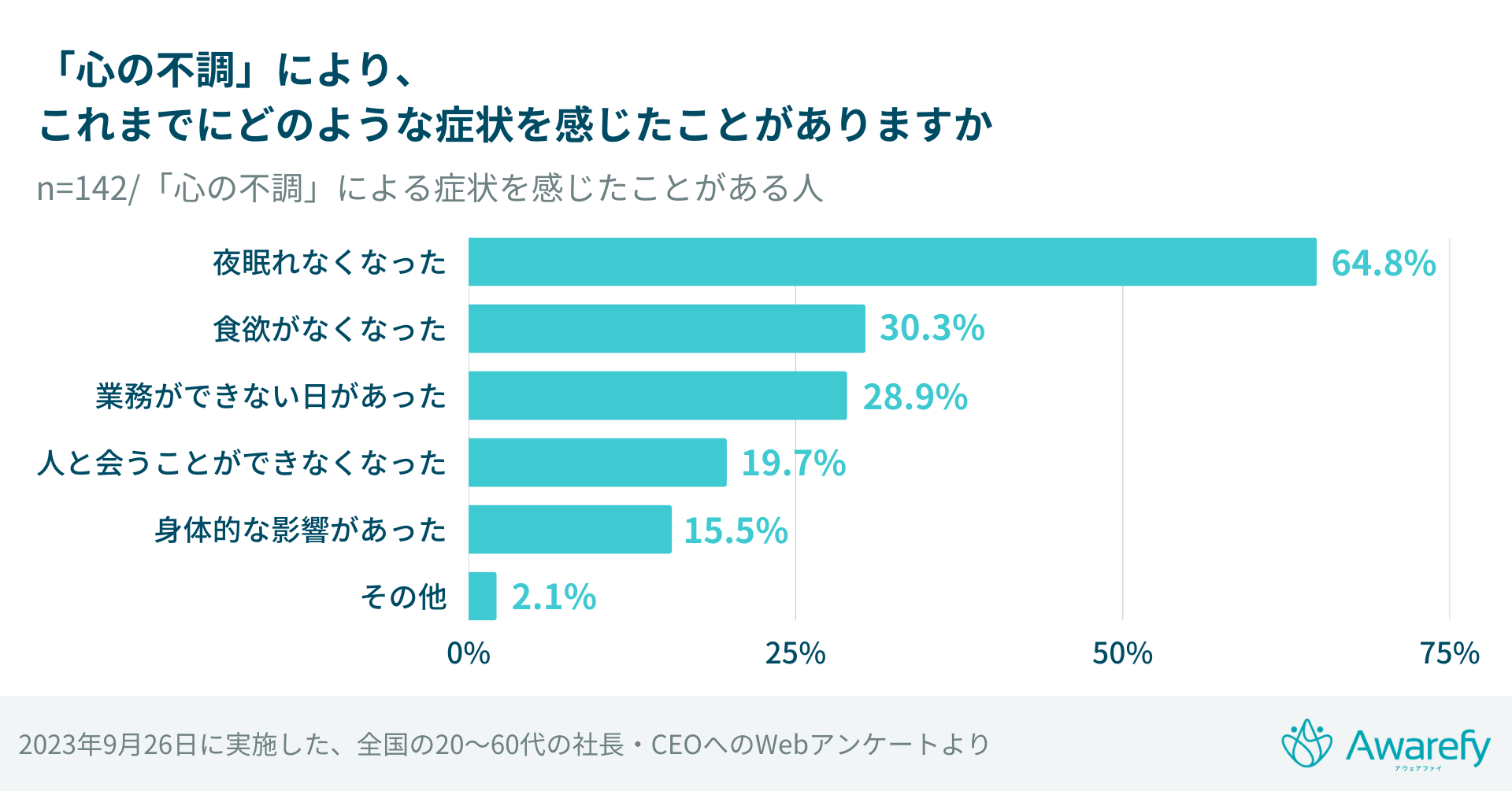 「心の不調」により、これまでにどのような症状を感じたことがあるか尋ねたところ、「夜眠れなくなった」が64.8%と最も高く、「食欲がなくなった」が30.3%、「業務ができない日があった」が28.9%と続きました(n=142/心の不調による症状を感じたことがある人)。