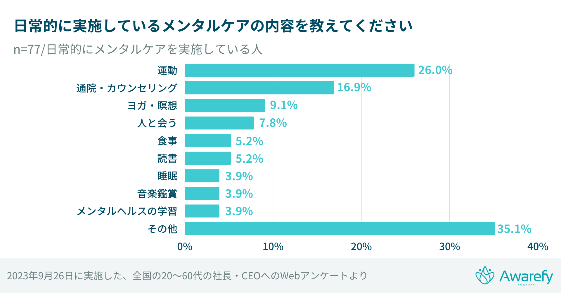 現在日常的に実施しているメンタルケアを尋ねたところ、「運動」が最も多く26.0%、「通院カウンセリング」が16.9%、「ヨガ・瞑想」が9.1%と続きました。その他の回答も多く集まり、メンタルケアの種類は多種多様であることがわかりました(n=77/日常的にメンタルケアを実施している人)。