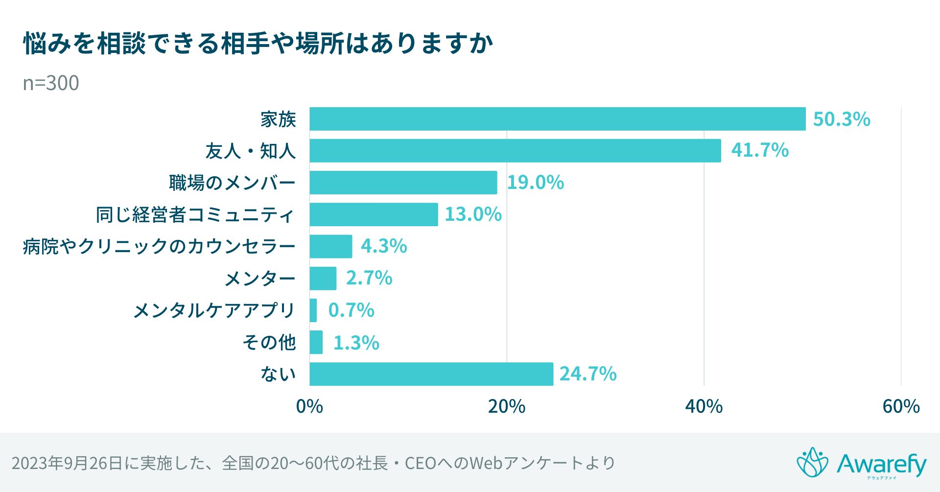 ​​悩みを相談できる相手や場所があるか尋ねたところ、「家族」が50.3%と最も多く、「友人・知人」が41.7%と続きました(n=300)。