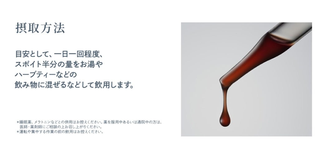 忙しく過ごす現代人の乱れやすい体内リズムに着目し、10種のハーブエキスを凝縮したリキッドタイプのサプリメント。