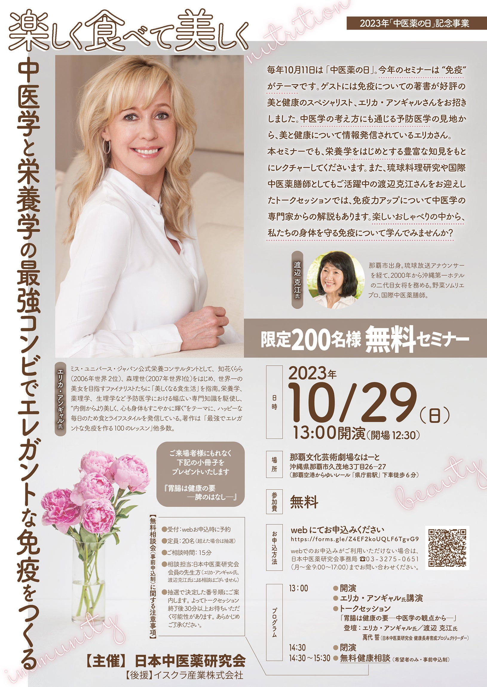 -中医学と栄養学の最強コラボでエレガントな免疫を作る-」を沖縄県那覇市にて開催します。ゲストに栄養コンサルタントであるエリカアンギャルさん、国際中医薬膳師渡辺克江さんをお招きし、楽しく「中医学(中国伝統医学)」が学べる楽しい催しです。なお当日の模様はYouTube Liveにて無料ライブ配信も行います。