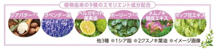 シアバター※¹、ラベンダー油、ベルガモット果実油、ホーリーフ※²、ネムノキ樹脂エキス、ホップ花エキス、他3種