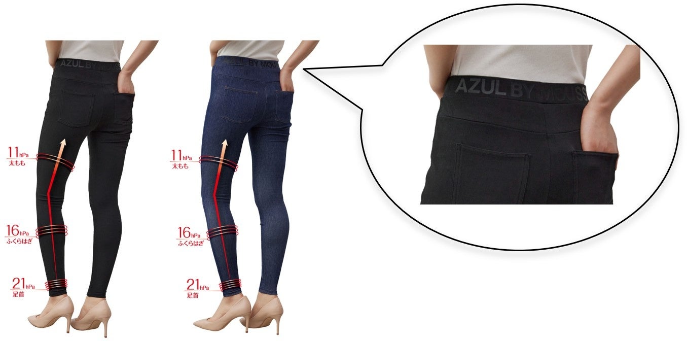 今回新発売する「SLIMWALK×AZUL 24hマルチスキニー」は、お外では洋服として、お家ではリラックスウェアとして使える万能な着圧レギパンです。医学から生まれた段階圧力設計(足首21hPa、ふくらはぎ16hPa、太もも11hPa)で、着用している間中、脚をスッキリケアするとともに、ほどよく脚を引きしめて美脚に魅せます。ストレッチ素材で動きやすく、お腹まわりはゆったりとした設計で就寝時も快適です。カラーは、BLUEとBLACKの2色を展開します。