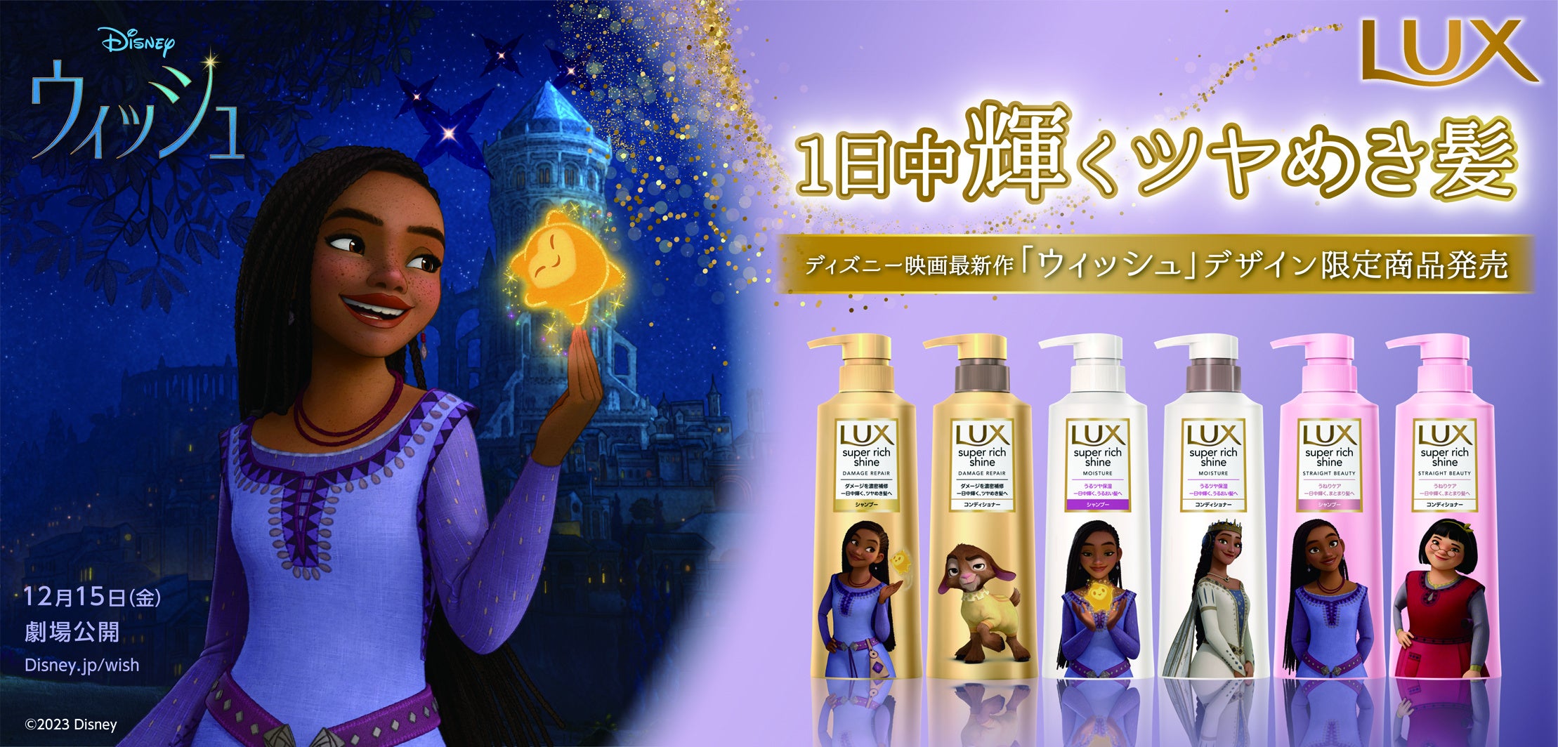 ラックスは、2021年9月より新たに掲げているブランドビジョン「LUX BRAVE VISION 2030」の中で、 “BRAVE”な人で溢れる社会を目指すために、あらゆる美しさの多様性を提示していく活動を行っています。2022年6月には、12名のディズニープリンセスをあしらった限定製品を、2022年10月には『アラジン』作品の限定製品を展開し、多様な美しさの在り方を知るきっかけや自分らしく生きる自信をサポートしてきました。そして今回は、ウォルト・ディズニー・カンパニー100周年を記念した映画『ウィッシュ』に登場する主人公「アーシャ」や相棒の「バレンティノ」などのキャラクターをあしらったディズニー映画最新作『ウィッシュ』限定デザイン品を展開いたします。