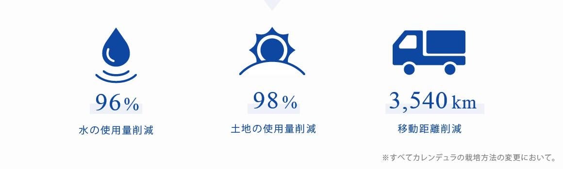 そうする事で、96%の水の使用量を削減、98%の土地の使用量を削減、3,540kmの移動距離削減を達成しています。