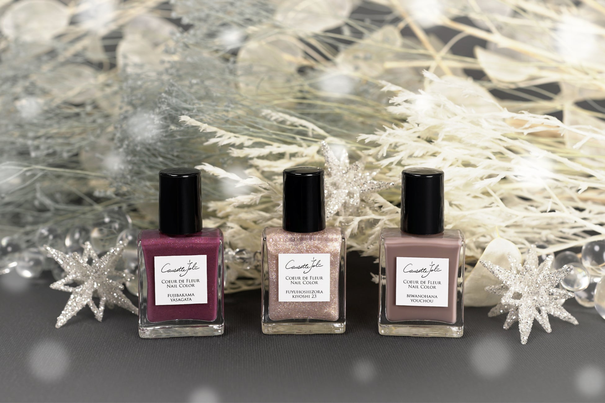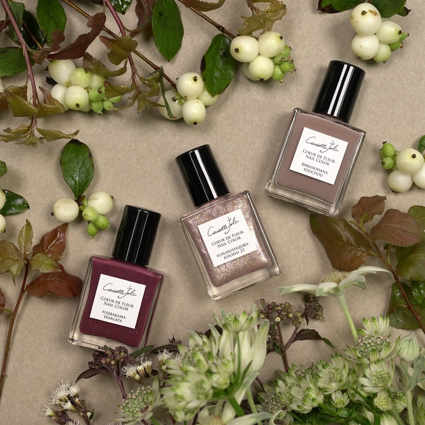 四季の中に咲く様々な花や季節の⾵景から感じる⾊の中から、肌なじみの良い⾊やその季節ならではの⾊をチョイスしたネイルカラー。カラー名は、花や情景の名前とそれらをイメージした⼤和⾔葉をつけています。