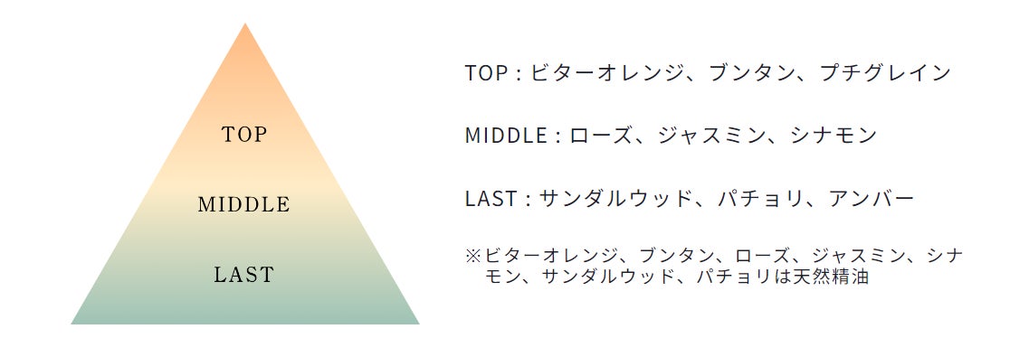爽やかなビターオレンジ、ブンタン、プチグレインのシトラス系トップノートからスタート。