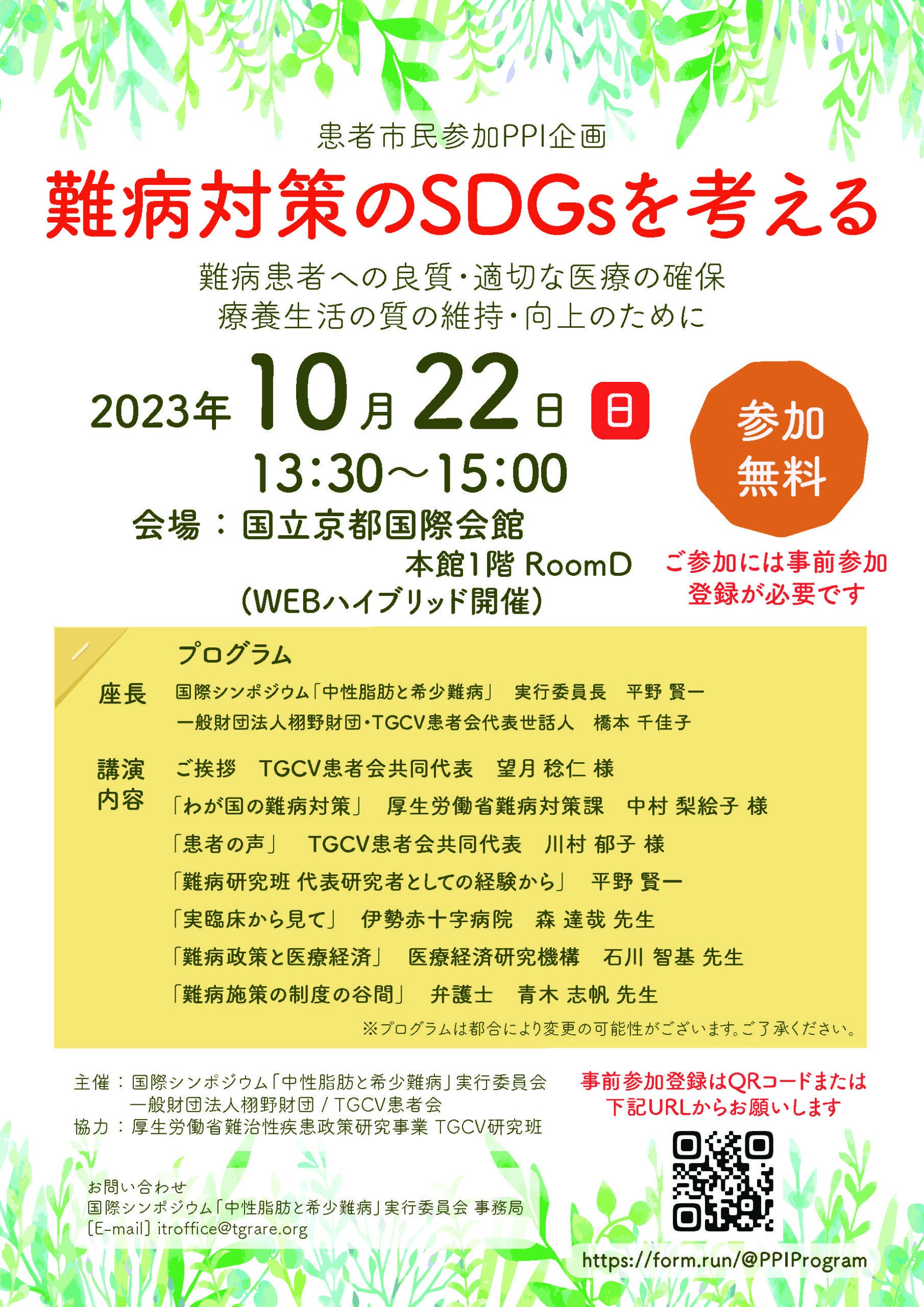 一方、世界共通の目標としてSDGsが叫ばれています。SDGsは、難病法制定と同じ平成27年に国連サミットにおいて全会一致で採択された持続可能な開発目標であり、誰一人として取り残されない社会を目指して、様々な活動、運動が地球規模で行われています。本PPI企画では、持続可能な難病患者支援そして難病対策の最終ゴールである個々の難病の克服、国民保健向上を果たすためには、「産・患・官・学」で何をなすべきかについて、本シンポジウムの対象疾患の一つである「中性脂肪蓄積心筋血管症(TGCV)」を1つのモデルとして、患者、市民、研究者、法律の専門家を交えて議論することを目的としています。