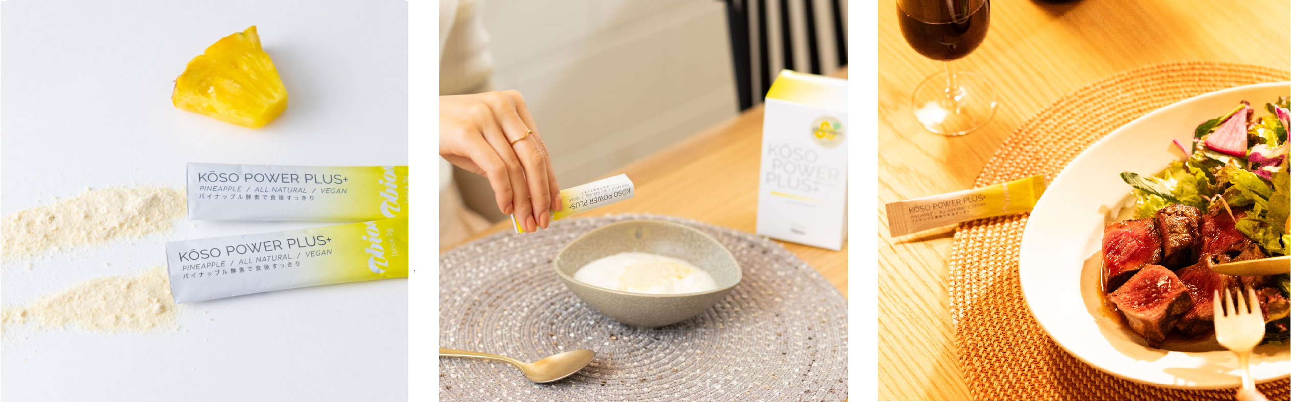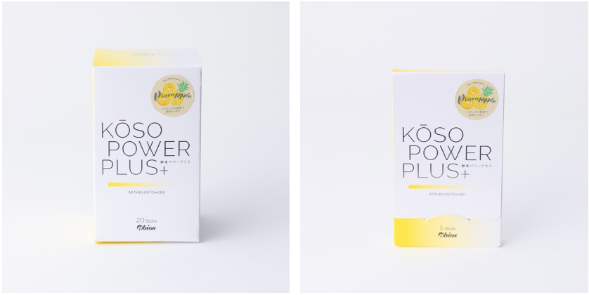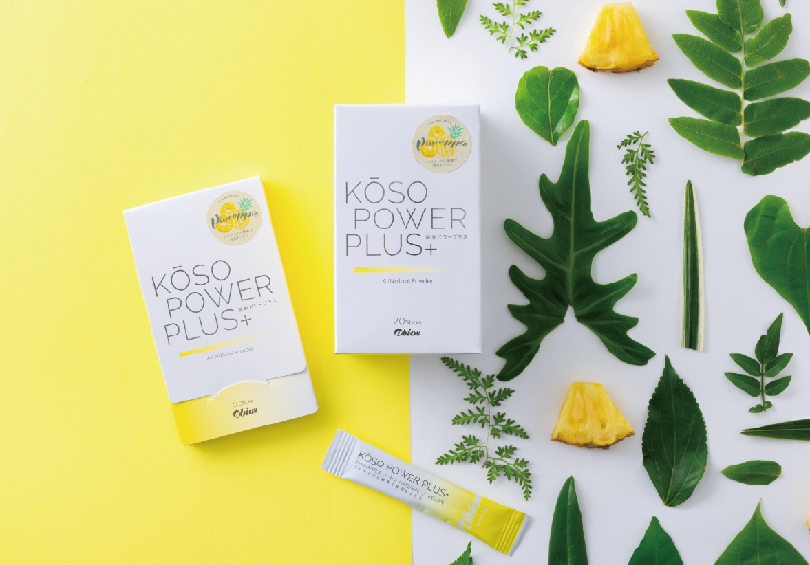 『KOSO POWER PLUS』は生のパイナップルに含まれるたんぱく質分解酵素・ブロメラインに注目し、農薬を使わずに育てた南米産パイナップルだけを丸ごと使用したスティックタイプの酵素パウダーです。ブロメライン酵素は、たんぱく質を体内で吸収されやすい細かい分子「アミノ酸」に分解する過程で手助けしてくれる事で知られています。『KOSO POWER PLUS』は低温乾燥で加工しているので、活きた酵素を摂取できます。