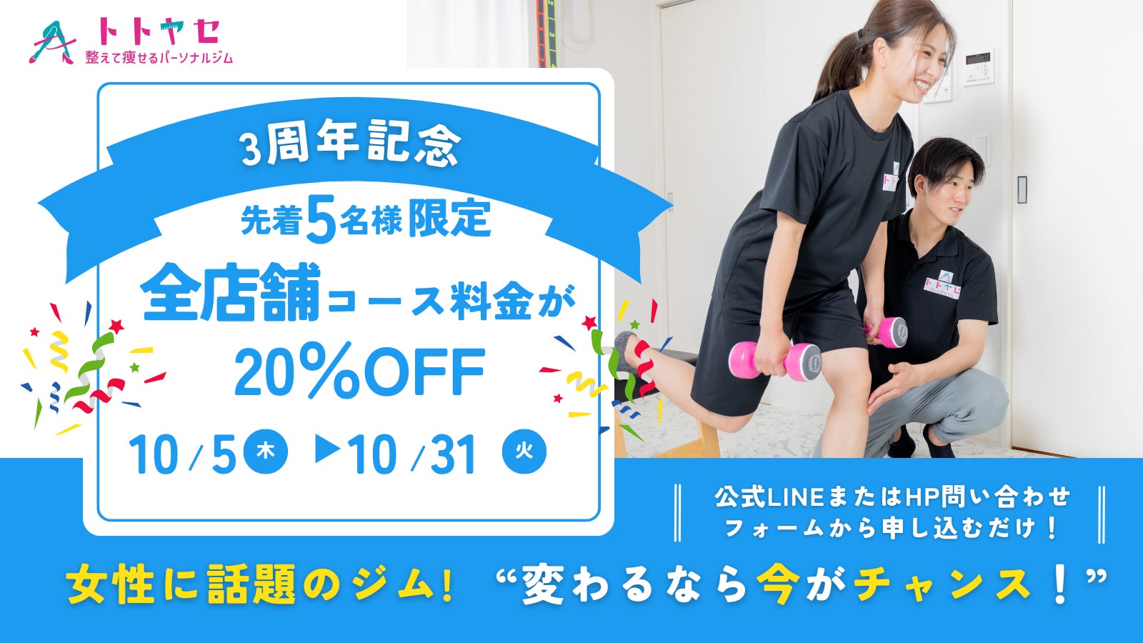 ❝整えて鍛えて痩せる❞に特化した、女性専門の下半身痩せ&姿勢改善パーソナルジム【パーソナルトレーニングジムトトヤセ天王寺店】が2023年10月15日(日)3周年目を迎えます!