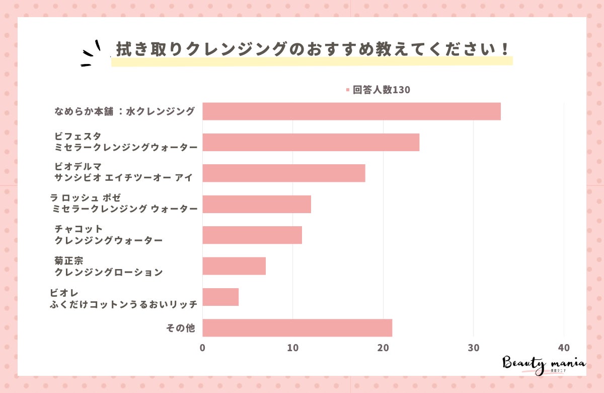 「拭き取りクレンジングのおすすめ教えてください!」とアンケート調査した結果、1位は『なめらか本舗 :水クレンジング(33人)』、2位は『ビフェスタ:ミセラークレンジングウォーター(24人)』3位は『ビオデルマ:サンシビオ エイチツーオー アイ(18人)』となっています。
