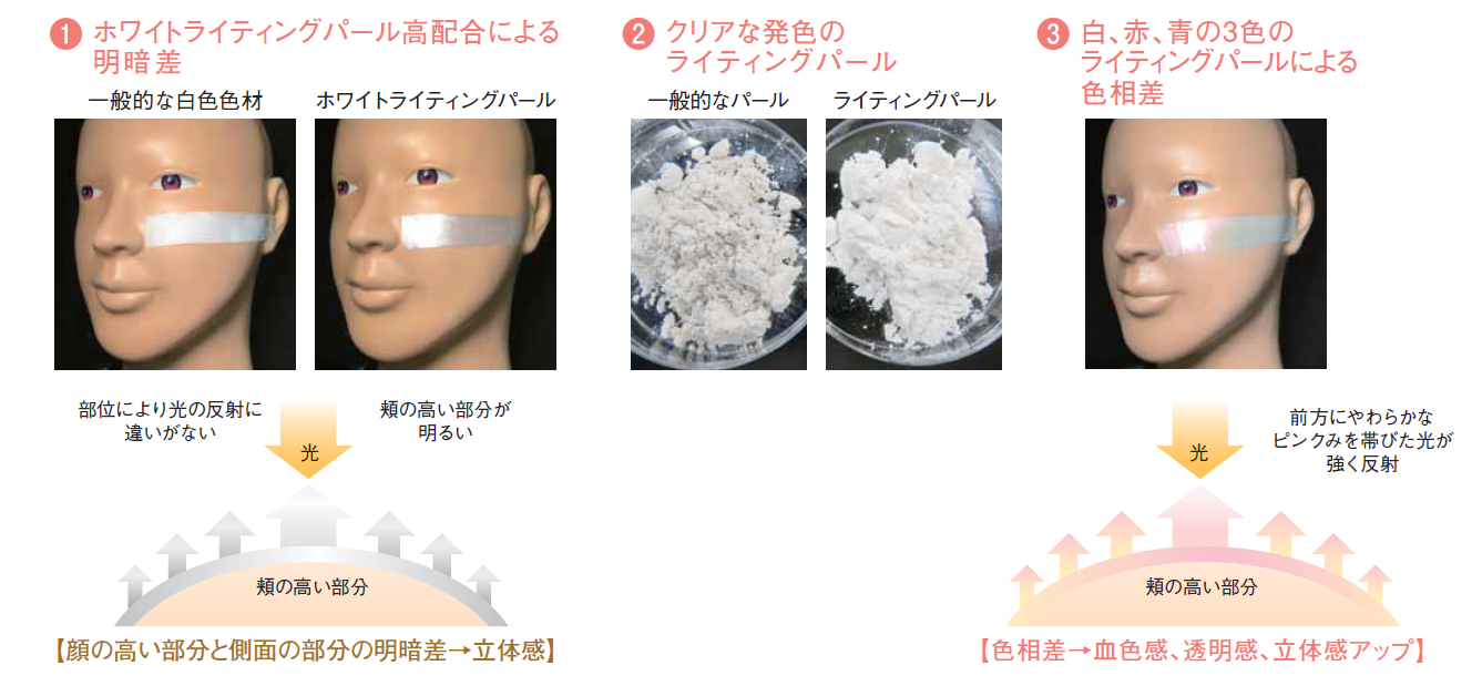 繊細かつクリアなパール<ライティング微細パール>を採用することで、不自然にぎらつくことなくパール剤を高配合でき、明るく澄んだ仕上がりを実現。顔の高い部分を明るく見せ、明暗差を作り出します。さらに、赤、青、白の3色のパール剤をブレンド。肌から浮かずに馴染み、色相もコントロールして透明感とメリハリのある仕上がりを叶えます。