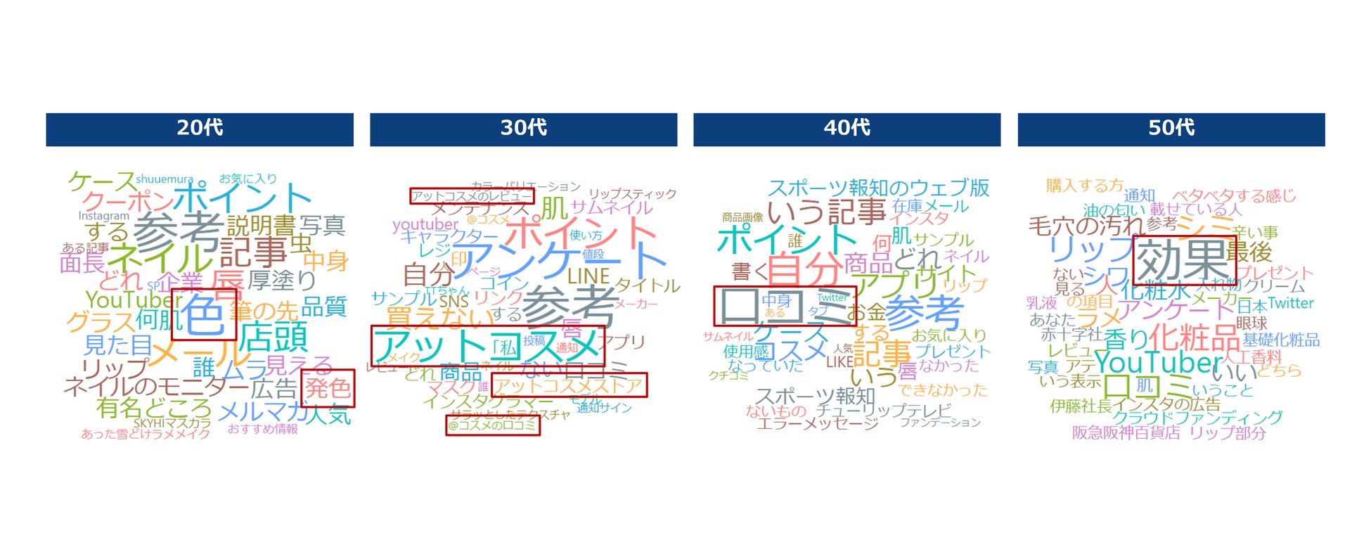 年代別にワードクラウドを作成し、それぞれの特徴的な話題を確認した。 各年代共通の話題は「参考」。おすすめアイテム等の参考情報を取るために利用しているものと推察。 年代別では、20代は色、30代はアットコスメ、40代は口コミ、50代は効果 について多く話題に挙げている。