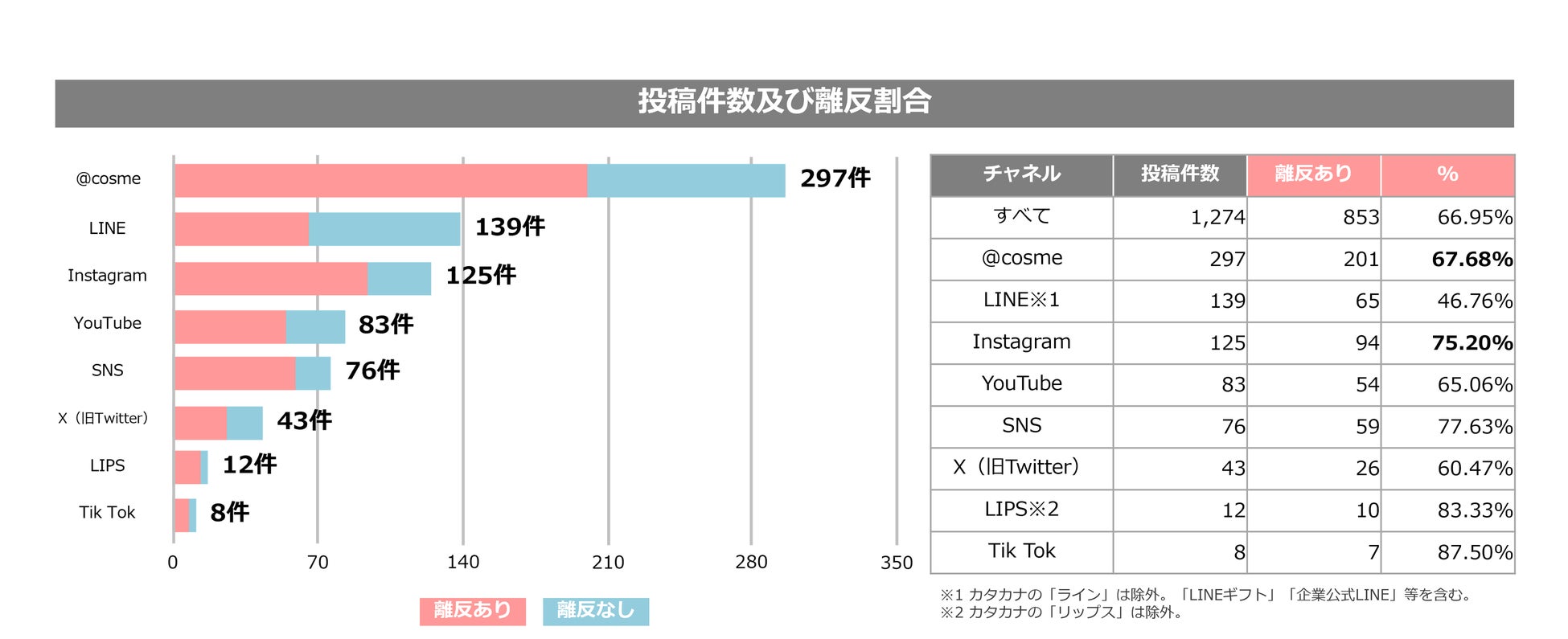 不満投稿文中に主要SNS及び口コミサイトの名称が含まれるものを個別に集計した。 投稿件数最多は「@cosme」、以下「LINE」「Instagram」と続いた。 不満の対象及び内容に関わらず、離反の有無の割合を確認したところ、上位3チャネルの中で「@cosme」及び「Instagram」が全体平均を上回った。