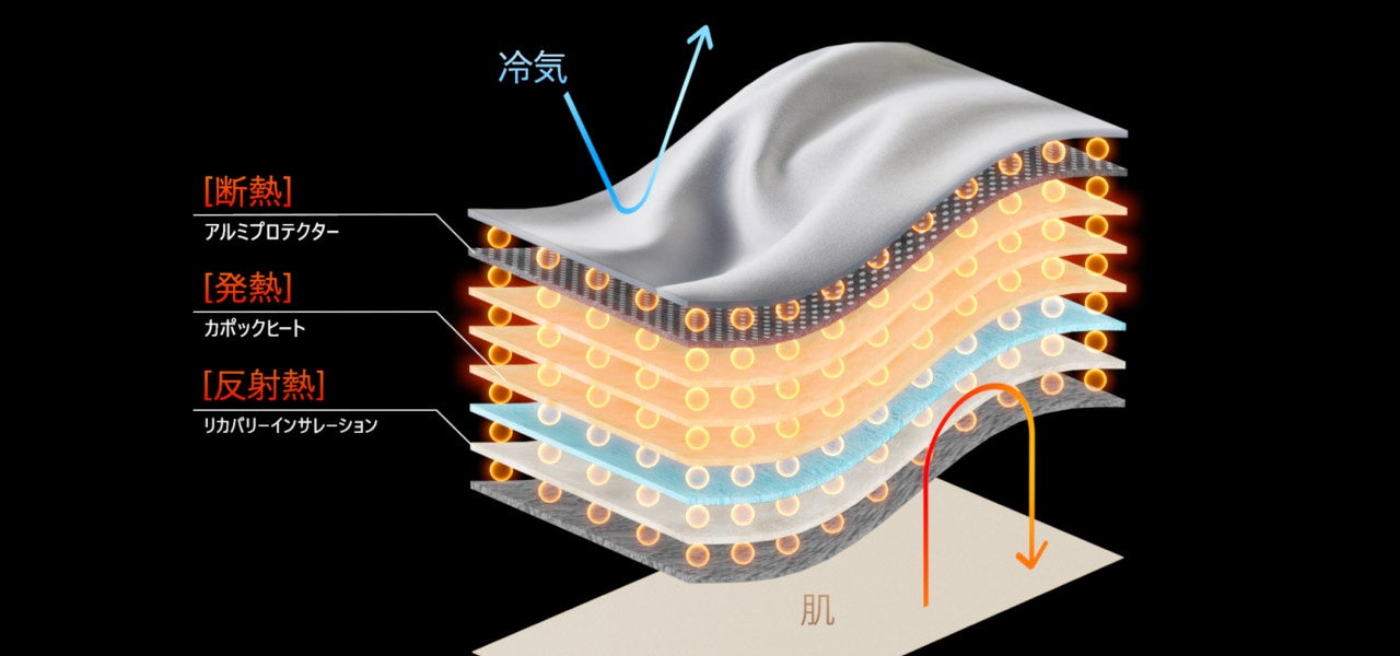 発熱・断熱・反射熱をもたらす先進テクノロジー素材をレイヤード。さらに8層が熱を保温し、暖かな熱を逃さない構造になっています。
