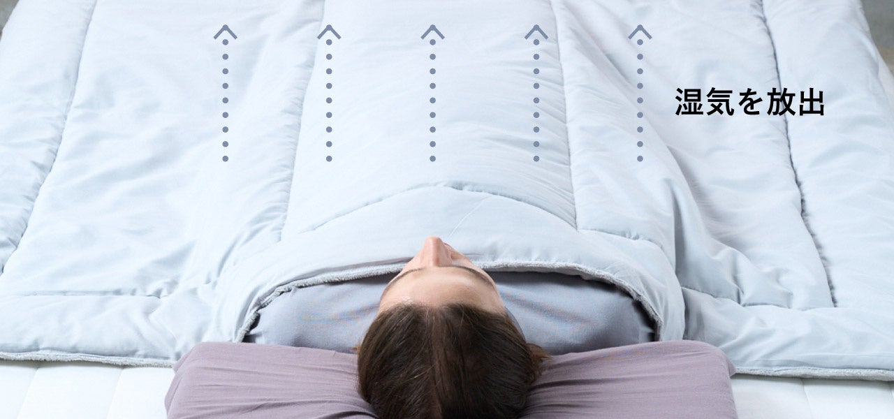 掛け布団全体で湿気を吸い、ムレない寝床内環境を実現。暖かいだけではなく、しっかりと湿気を放出します。