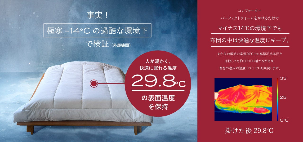 「パーフェクト ウォーム」は1枚かけるだけでマイナス14℃の環境下でも、人が暖かく、快適に眠れる温度29.8℃の表面温度を保持することができ、布団の中は快適な温度に保たれました。※外部試験機関の人工気象室の最下限温度-14℃でのサーモグラフィでの保温性試験を実施。
