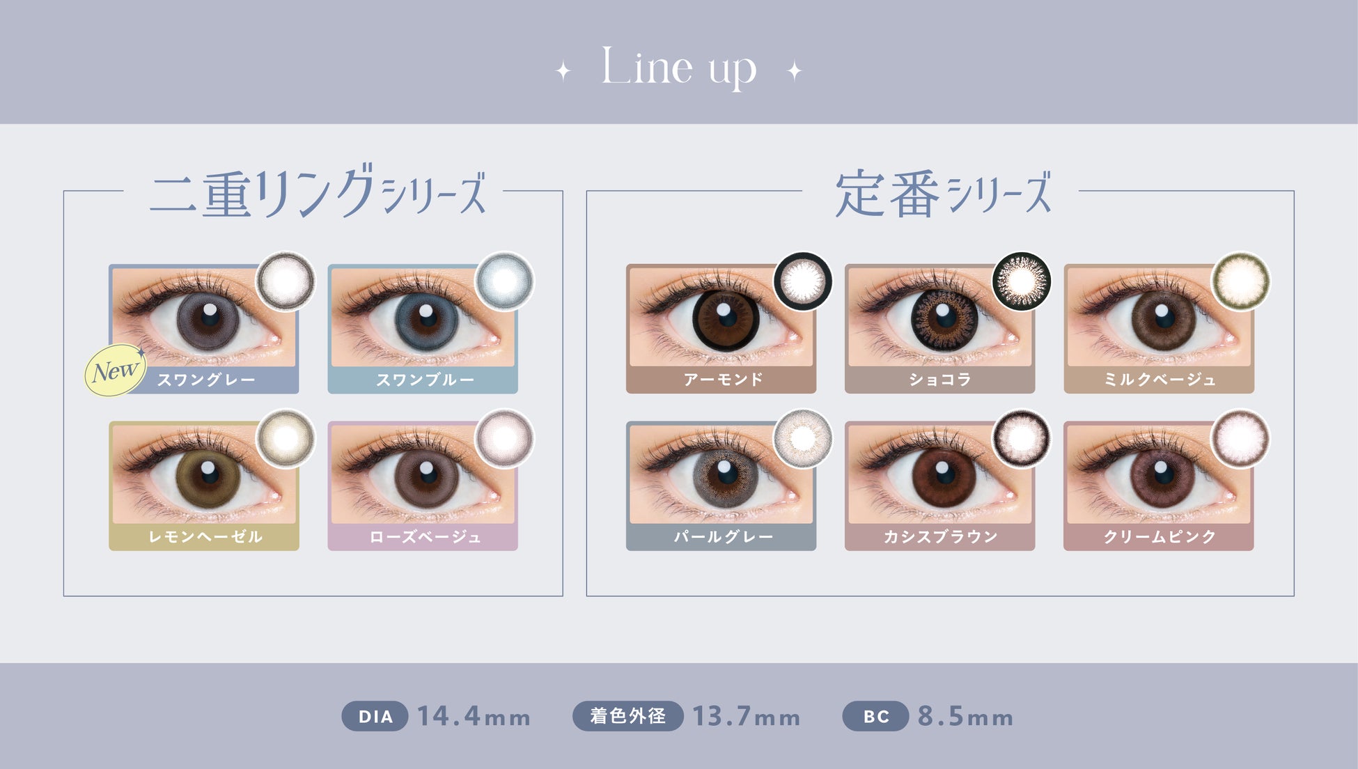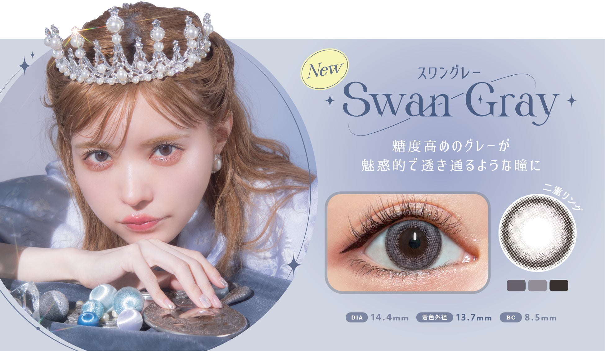 益若つばさデザインプロデュース「バンビシリーズワンデー」から、絶妙甘めグレーの新色『スワングレー』が新登場。昨年6月に発売され、現在もSNSを中心に多数の支持を集める『スワンブルー』の色違いとなっています。スワンブルーの透明感はそのままに、バンビシリーズらしいドーリーさも忘れないNEWカラー。