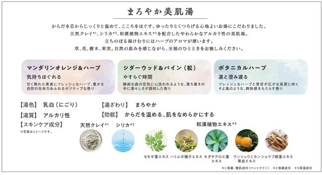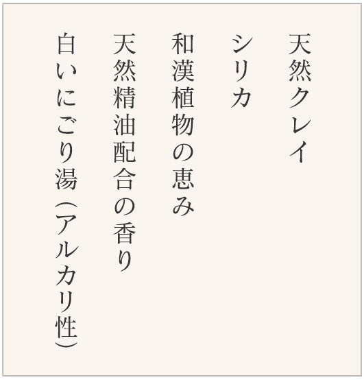 からだとこころをゆったりと休める「まろやか美肌バスパウダー」は、天然クレイ(ベントナイト:吸着、整肌成分)、シリカ(吸着成分)、和漢植物エキス(保湿成分)を配合したやわらかなアルカリ性の美肌湯。