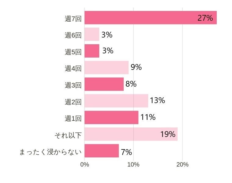 20代女子のうち毎日入浴(湯船に浸かる)というかたは27%で、他世代よりも少ないという結果になりました。しかしそれ以下・まったく浸からないというかたも合わせて26%で、毎日ではないものの週1以上は浸かるというかたが74%という結果となりました。