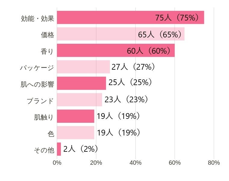 入浴剤を選ぶ際の重視ポイントとしては、効能・効果がトップで75%。続いて価格が65%、香りが60%と続きます。